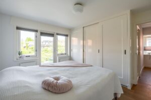 De ouderslaapkamer is gelegen aan de achterzijde en is van groot formaat. De grote raam partij met openslaande deur zorgt voor veel licht en je kijkt vrij weg over de wijk. Er is een prachtige inbouwkast gemaakt.