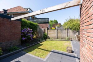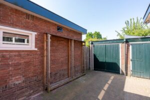 Naast de tuin staat een grote stenen garage met veel ruimte bijvoorbeeld voor het stallen van fietsen en tuinspullen. Je auto kun je kwijt op de oprit naast de woning.
