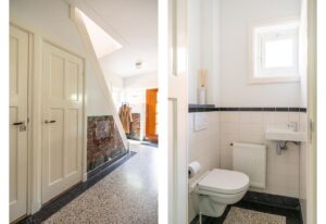 In de hal vind je de meterkast, het toilet en de toegang tot de kelder onder de trap. De hal geeft tenslotte toegang tot de ruime leefruimte beneden.