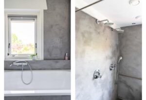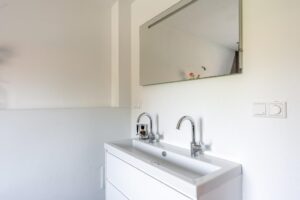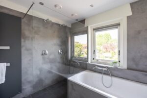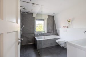 De badkamer is in 2016 volledig vernieuwd. De badkamer is afgewerkt met mooie beton ciré en de ruimte is optimaal gebruikt waardoor er zowel plek is voor een toilet, ruime dubbele inloopdouche, ligbad maar ook een wastafel met dubbele kranen. De vloerverwarming maakt de badkamer heerlijk comfortabel.