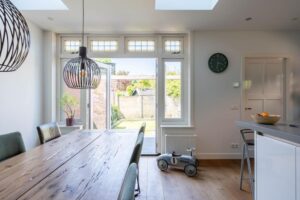 De achterkamer is uitgebouwd en hier is een heerlijke woonkeuken gekomen. De daklichten en de openslaande deuren naar buiten maken het een prettige, lichte kamer waar je graag vertoeft.