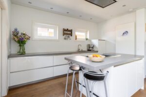 De neutrale kleurstelling van de keukenkasten in combinatie met het mooie composiet blad maakt het smaakvolle geheel af.