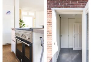 Achter de keuken is een praktische bijkeuken gerealiseerd. Deze is netjes afgewerkt met inbouwkasten waar onder andere de wasmachine/droger aansluitingen zijn weggewerkt.