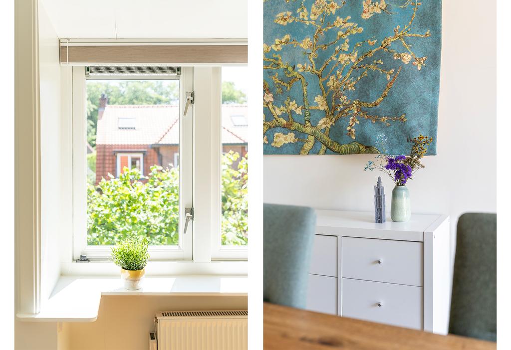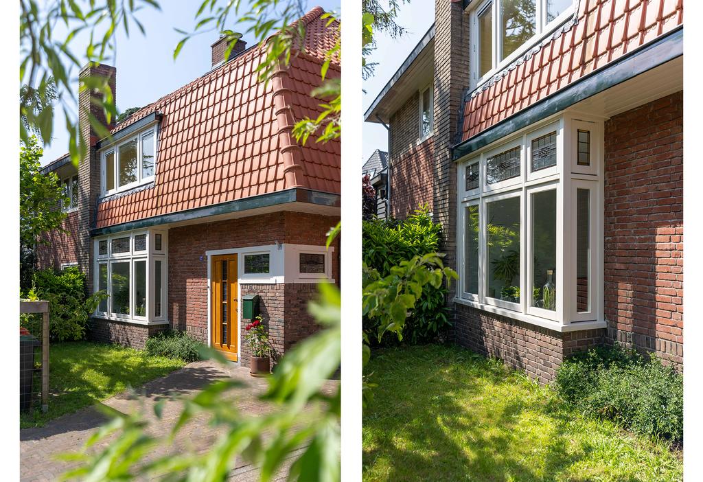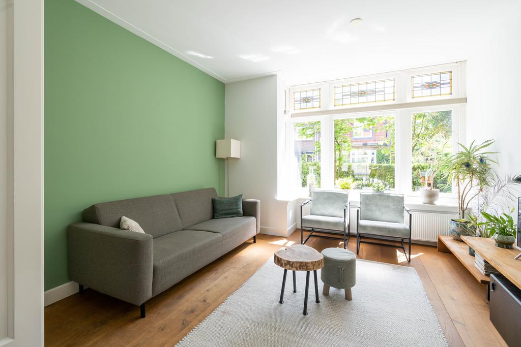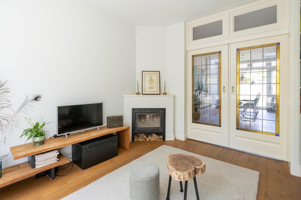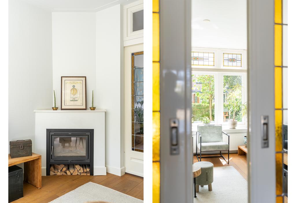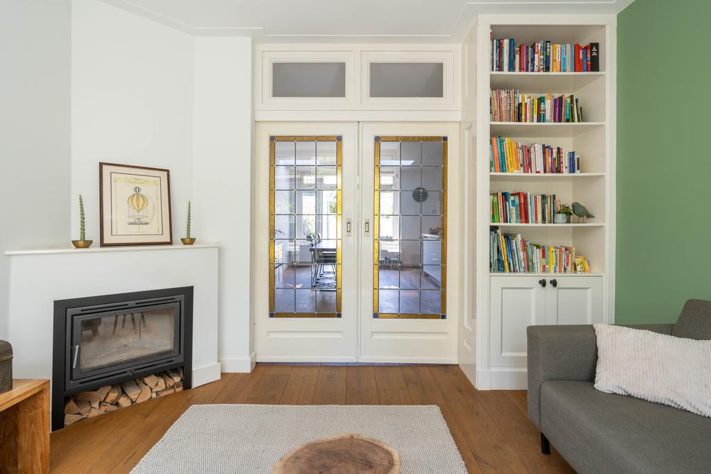 In de woonkamer is de en suite op smaakvolle wijze teruggebracht. Hierdoor is een heerlijke knusse voorkamer gecreëerd met een gezellige zithoek. De erker en de fijne haard zorgen hier voor instant sfeer. Vanuit de erker met het grote raam aan de voorzijde kijk je gezellig weg over de groene tuin en het karakteristieke straatbeeld.