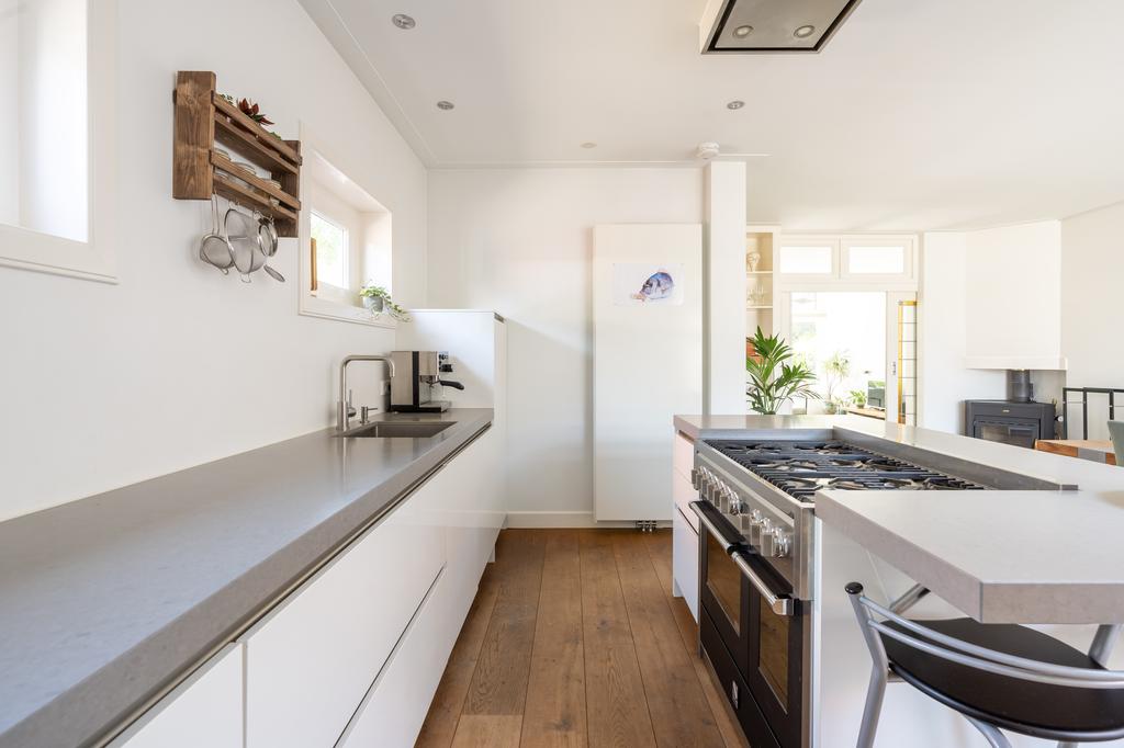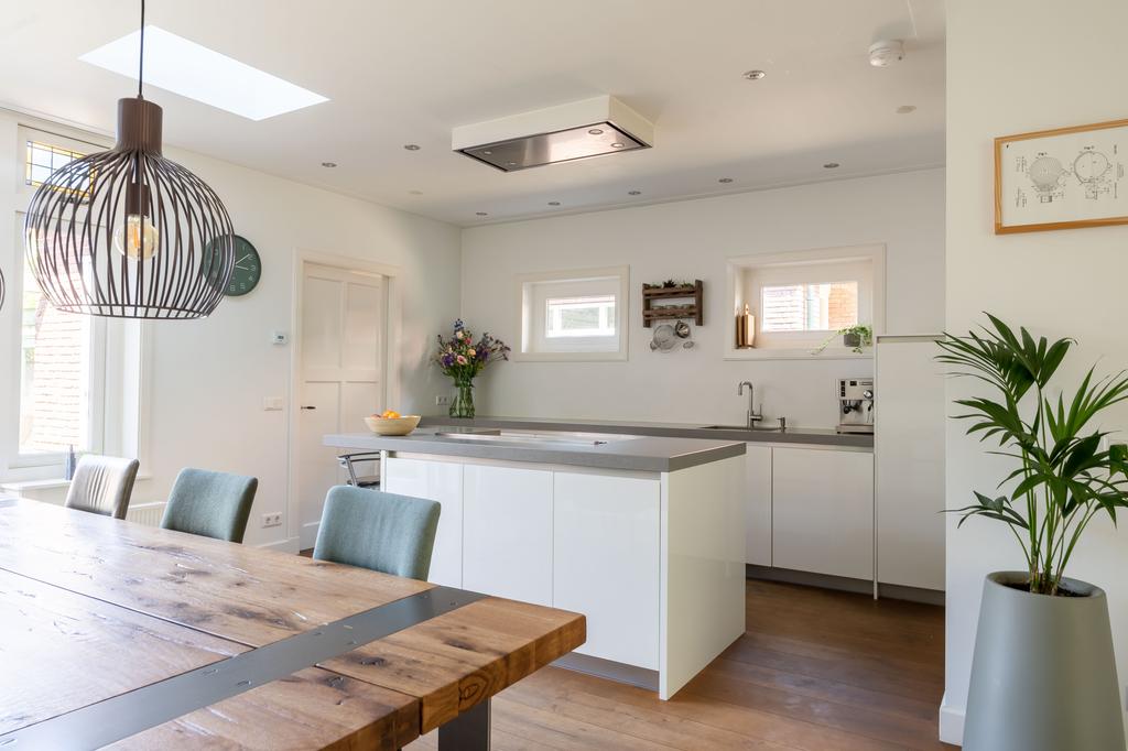 De achterkamer is uitgebouwd en hier is een heerlijke woonkeuken gekomen. De daklichten en de openslaande deuren naar buiten maken het een prettige, lichte kamer waar je graag vertoeft.