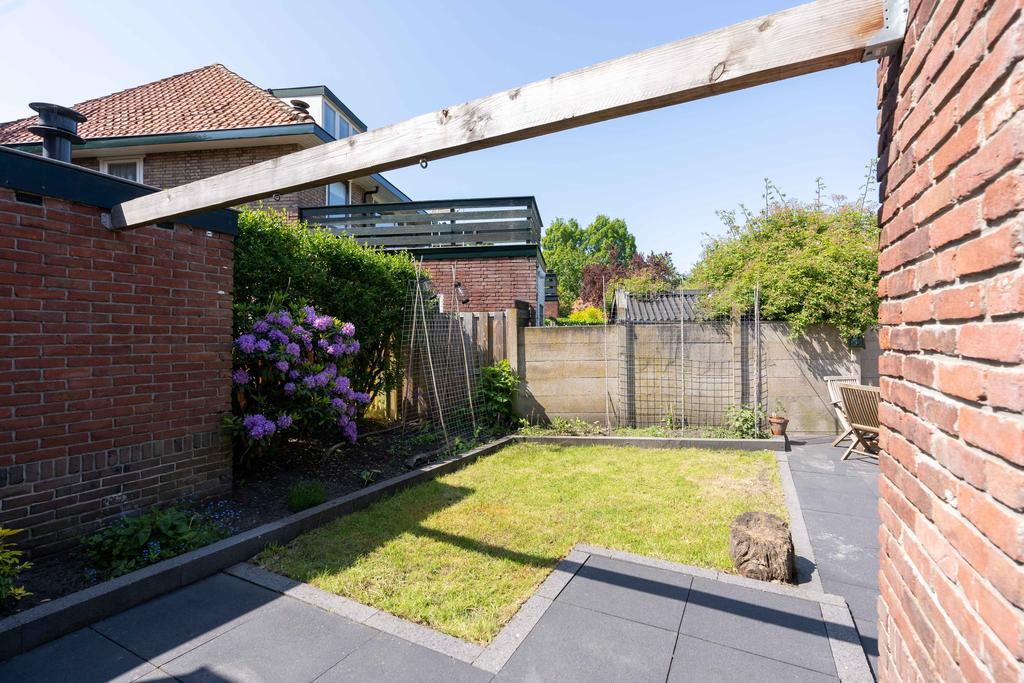 Naast de tuin staat een grote stenen garage met veel ruimte bijvoorbeeld voor het stallen van fietsen en tuinspullen. Je auto kun je kwijt op de oprit naast de woning.