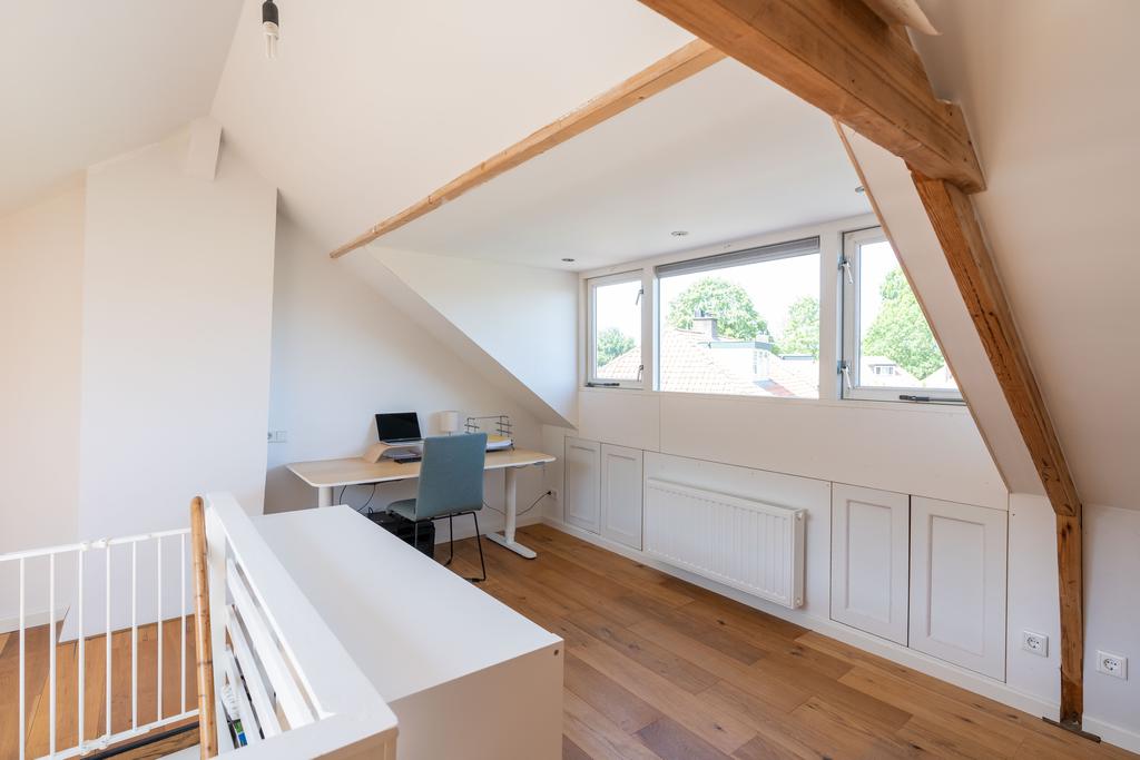 Met een vaste trap kom je op de tweede verdieping. Deze verdieping is wederom een volwaardige woonlaag. De dakkapel aan de achterzijde zorgt voor ruimte en licht. Hier vind je een ruime kamer die op dit moment als kantoor in gebruik is. De huidige kamer meet ca. 16 m2 en heeft weer een strakke afwerking.