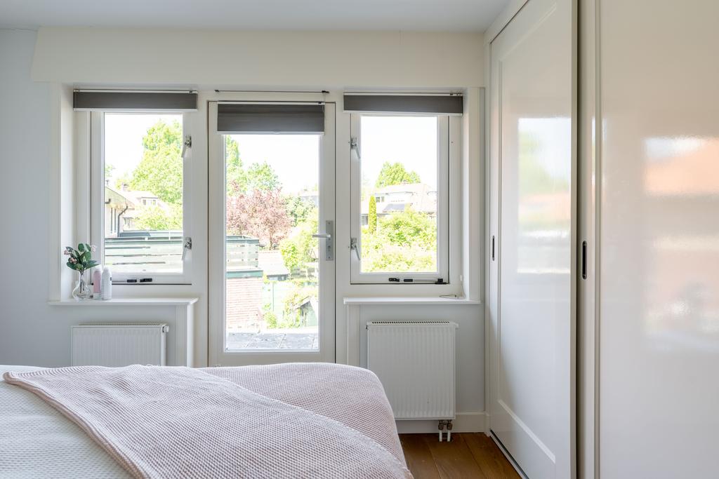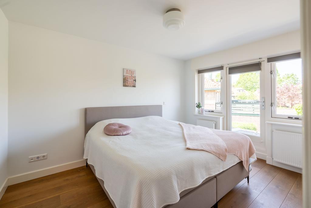 De ouderslaapkamer is gelegen aan de achterzijde en is van groot formaat. De grote raam partij met openslaande deur zorgt voor veel licht en je kijkt vrij weg over de wijk. Er is een prachtige inbouwkast gemaakt.