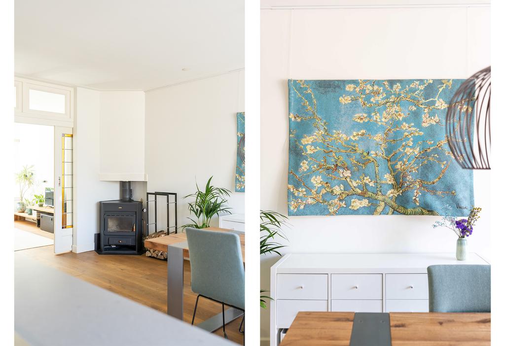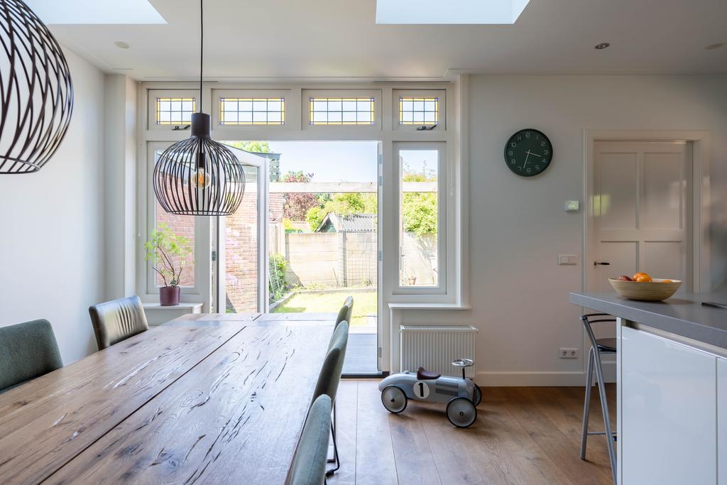 Hier vind je de houtkachel, die tevens de radiatoren van de woning verwarmt. Een sfeermaker in de achterkamer waar een heerlijke plek voor een grote eettafel is gekomen om lekker lang te tafelen.
