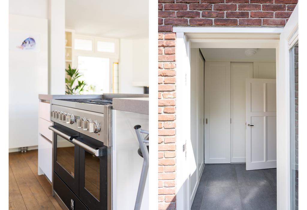 Achter de keuken is een praktische bijkeuken gerealiseerd. Deze is netjes afgewerkt met inbouwkasten waar onder andere de wasmachine/droger aansluitingen zijn weggewerkt.
