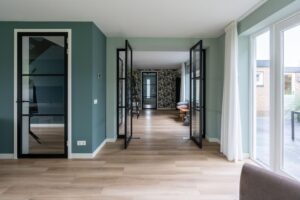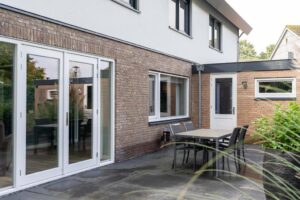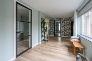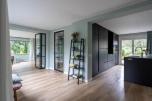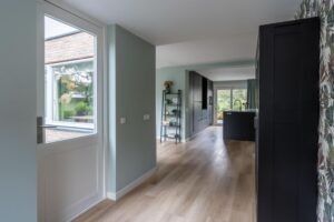 Via de glazen taatsdeuren komt u in het nieuwe gedeelte van de woning; een riante ruimte die invulling geeft aan een grote woonkeuken, werkkamer en de zij-entree van de woning.