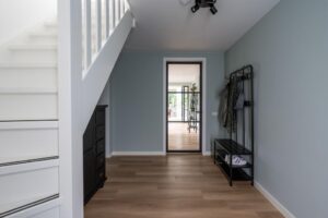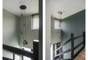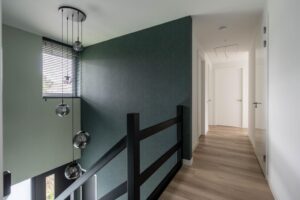 De voordeur brengt u in de centrale hal. De hal is van fors formaat heeft een prachtige hoogte van circa 5 meter die wordt benadrukt door de vide. De zwarte glasdeuren naar de woonkamer maken het plaatje compleet. Wat een prachtig binnenkomen.