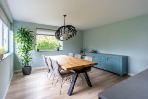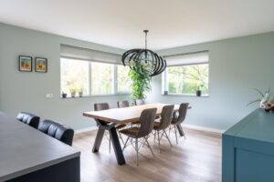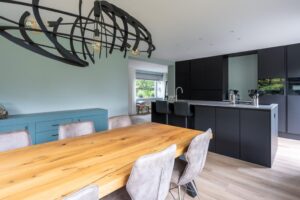 In de woonkeuken is plaats voor een grote tafel waar u met familie en vrienden heerlijk kunt borrelen en tafelen, de ruimte is ernaar. Terwijl u aan het koken bent, praat u gezellig bij na een drukke dag. Ook hier zijn weer grote raampartijen waardoor de ruimte licht aanvoelt. De loopdeur naar het terrasje aan de voorzijde is goed bedacht, hier vind u vanaf het middaguur de zon.