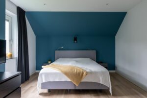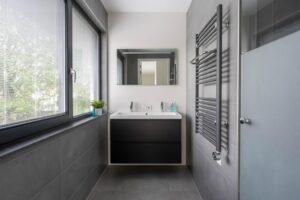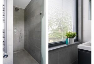 Bij deze kamers is voorzien in een aparte badkamer met inloopdouche en wastafelmeubel in eenzelfde neutrale grijs/wit kleurstelling als de eerste badkamer. De ruimte wordt verwarmd met vloerverwarming en is tevens voorzien van een elektrische design radiator. Een mooi detail is hoe de horizontale lamellen tussen het dubbelglas van het raam zijn geplaatst.