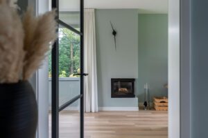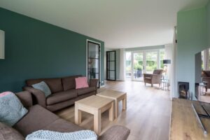 De centrale hal geeft toegang tot de woonkamer, het oude gedeelte van de woning dat niet aan knusheid heeft ingeboet. Hier zit u gezellig bij elkaar. De living is ruim en de vele raampartijen zorgen voor veel licht. Verschillende zitjes en opstellingen zijn mogelijk. Door de toevoeging van de openslaande deuren kunt u in de zomer heerlijk het terras op lopen. In de living vindt u de gesloten houtkachel, die in de winter de fijne sfeer geeft van het haardvuur.