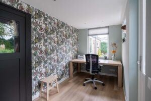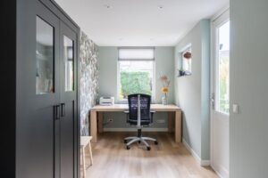 De werkkamer is tegenover de woonkamer gelegen en biedt een fijne, knusse plek om in alle rust te werken. Eventueel is deze ruimte ook geschikt als speelhoek voor de kinderen of een extra tv-ruimte. De raampartijen geven prettig daglicht. Ook hier is een loopdeur naar de achtertuin met het terras waardoor u altijd de verbinding voelt met de tuin.
