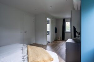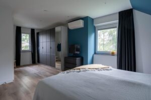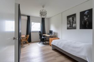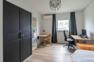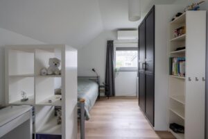 De twee slaapkamers aan de westzijde van de woning zijn respectievelijk 15 m2 en 16 m2 groot, meer dan genoeg ruimte voor een bed, studeerplek en eventueel game- of speelruimte. De kamers hebben ieder een eigen airco-unit voor koelen of verwarmen. In beide kamers volop licht door de mooie raampartijen.