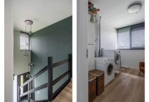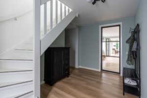 Vanuit de zijentree is een open ruimte die nu dienst doet als garderobe en berging. Hier is de ideale plek voor een bijkeuken. Het leidingwerk voor water en afvoer zijn al voorbereid waardoor een keukenblad met spoelbak makkelijk is te plaatsen. Daarnaast een mooie plek voor een wasmachine-/drogeropstelling, mocht u deze opstelling op de begane grond willen hebben.