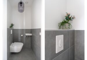 Het toilet is ruim, in neutrale grijstinten en voorzien van hangend closet met fonteintje.