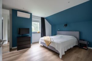 Aan de oostelijke kant van de woning naast de trap vanuit de hoofdentree ligt de ouderslaapkamer. Werkelijk een prachtige ruimte met inbouwkast en een badkamer en suite. De kamer is ruim en hier hangt een eigen airco-unit om te koelen of te verwarmen.