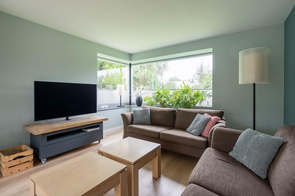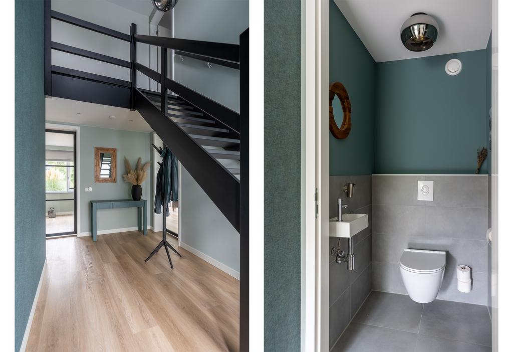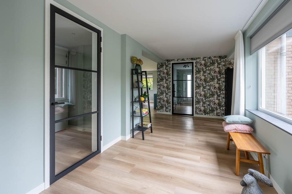 Vanuit de hal bereikt u het toilet, de living en de woonruimte met keuken. De vloer is afgewerkt met een mooie houtlook PVC-vloer in warme kleurstelling. Deze vloer loopt door in alle binnenruimtes op deze woonlaag wat de ruimte benadrukt. Natuurlijk is ook de wandafwerking strak.