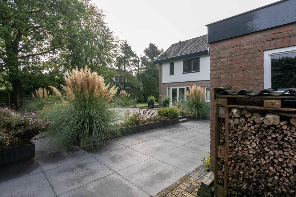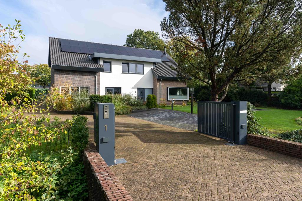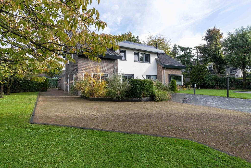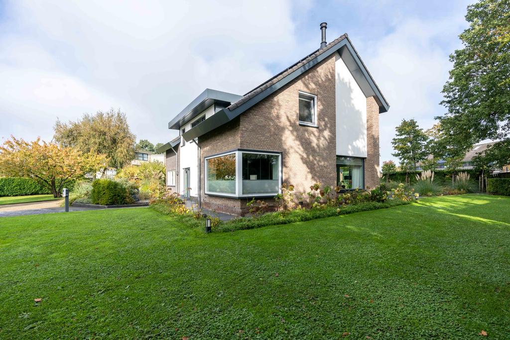De prachtige villa is het enige huis in de straat. Via het bruggetje over de sloot komt u het eigen terrein op. Wat een zalig thuiskomen! Aan de voorzijde is parkeergelegenheid met voorziening voor een laadpaal gecreëerd. Aan de zijkant is een heerlijke tuin met fruitbomen wat een beschut gevoel geeft. Aan de voorzijde wordt het huis omlijst door rijkelijk begroeide borders met diverse sierplanten. Naast de entree, voor de keuken ligt een leuk, klein terras. Een fijne plek van waaruit u plezierig en beschut wegkijkt over de voortuin.