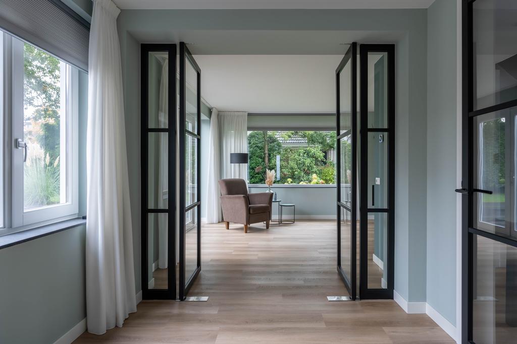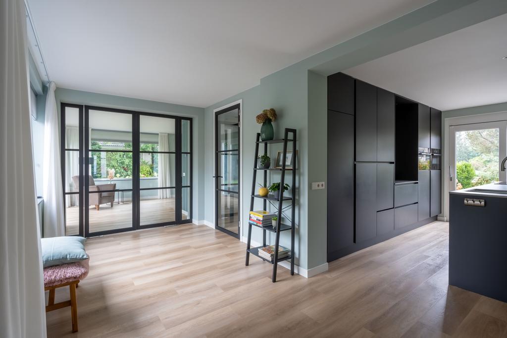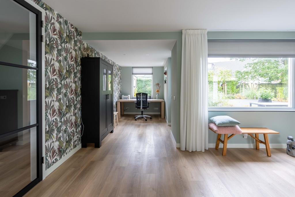 Via de glazen taatsdeuren komt u in het nieuwe gedeelte van de woning; een riante ruimte die invulling geeft aan een grote woonkeuken, werkkamer en de zij-entree van de woning.