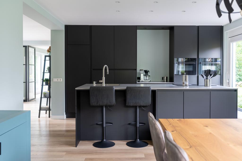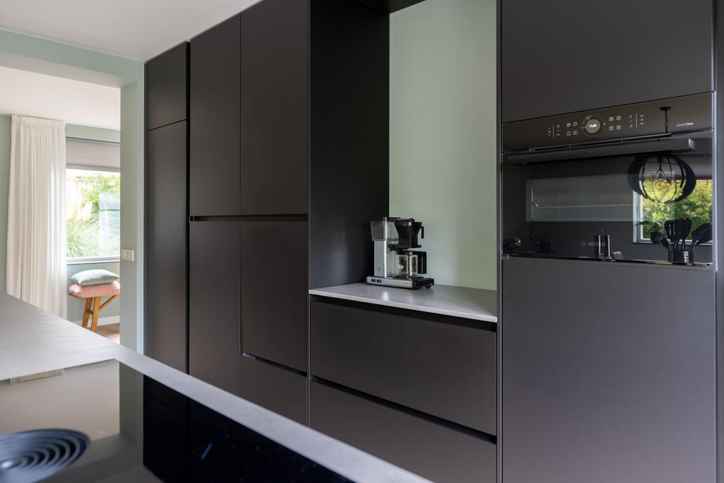 De riante woonkeuken is door de kleurstelling van donkere kasten met lichtgrijs werkblad een prachtige, moderne keuken en natuurlijk voorzien van alle gemakken; zo vindt u aan de muurzijde de kasten met verhoogde vaatwasser, een praktische koffiecorner en daar tegenover in de ruimte het grote kookeiland met barretje. Het kookeiland is voorzien van een spoelbak met Quooker kraan en een inductieplaat met geïntegreerd Bora afzuigsysteem. Er is veel werkblad om lekker aan te kokkerellen. De bergruimte in de kastjes onder het kookeiland is fors.