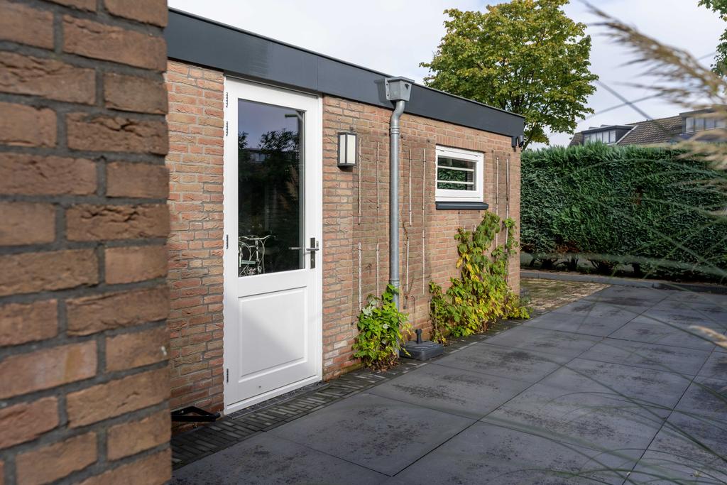 Via de bijkeuken is de schuur te betreden. Deze is maar liefst 28 m2 en hier kunt u alle fietsen, tuin- en klusspullen herbergen. Met twee deuren aan beide zijdes is omlopen naar de zij- of achtertuin niet nodig.