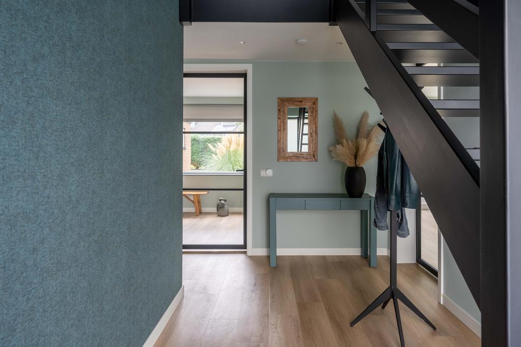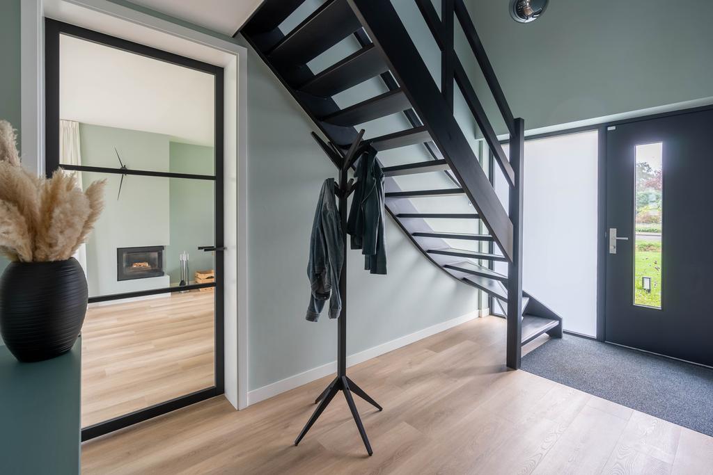 De voordeur brengt u in de centrale hal. De hal is van fors formaat heeft een prachtige hoogte van circa 5 meter die wordt benadrukt door de vide. De zwarte glasdeuren naar de woonkamer maken het plaatje compleet. Wat een prachtig binnenkomen.