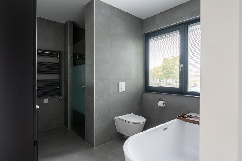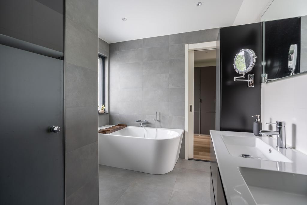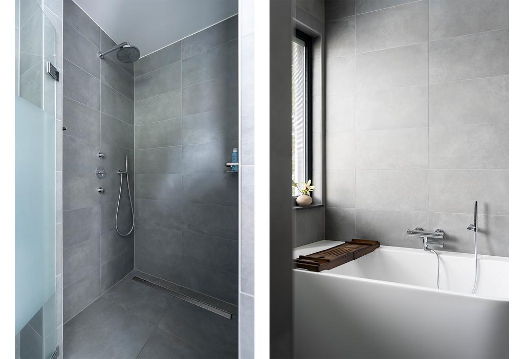 Bij deze kamers is voorzien in een aparte badkamer met inloopdouche en wastafelmeubel in eenzelfde neutrale grijs/wit kleurstelling als de eerste badkamer. De ruimte wordt verwarmd met vloerverwarming en is tevens voorzien van een elektrische design radiator. Een mooi detail is hoe de horizontale lamellen tussen het dubbelglas van het raam zijn geplaatst.