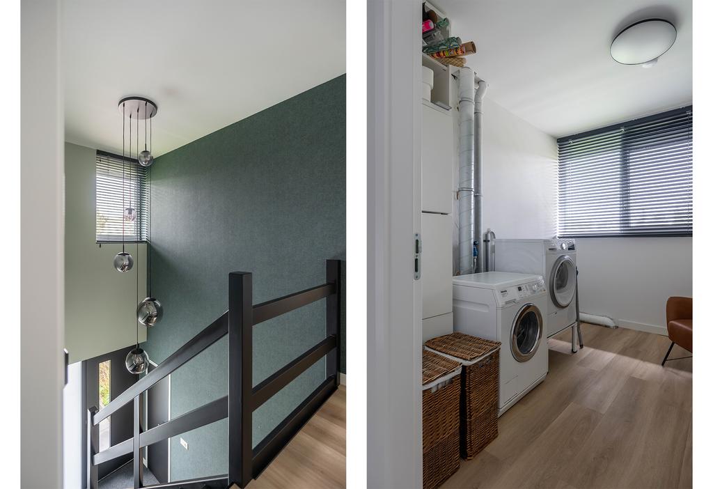 De tweede woonlaag is te bereiken zowel via de trap aan de kant van de hoofdentree als via de trap bij de zijentree. Omdat de nok van de oorspronkelijke woning is verhoogd, is een volwaardige bovenverdieping ontstaan met drie grote slaapkamers, twee badkamers, een waskamer en een ruime bergzolder als kers op de taart. De vloeren van de overloop en de slaapkamers zijn ook hier van PVC en de wandafwerking is keurig.