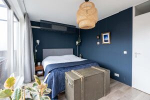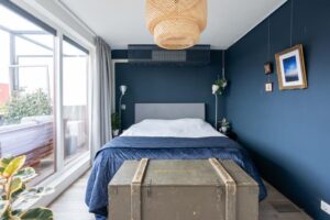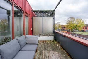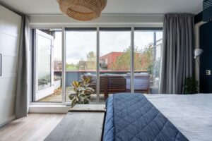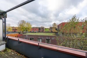 Nog een verdieping hoger vind je tenslotte de tweede ruime slaapkamer en een grote badkamer. De slaapkamer is met ca. 15 m2 van ruim formaat. Door de grote raampartijen is het een heerlijke lichte ruimte. De slaapkamer biedt toegang naar het ruime dakterras waar je zowel in de middag als in de avond van de zon en privacy kan genieten.