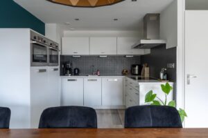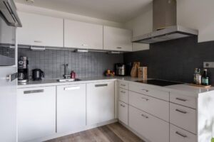 De trap brengt je naar de leefruimte op de tweede woonlaag. Hier vind je de keuken en woonkamer. De open keuken is in moderne kleurstelling met witte frontjes en een wit werkblad wat fraai combineert met de zwarte wandtegels. Door de hoekopstelling is veel werkruimte en genoeg plek voor al je keukenspullen. De keuken beschikt over alle nodige keukenapparatuur zoals vaatwasser, inductiekookplaat, koelkast, vriezer en een dubbele (stoom)oven/magnetron combinatie.