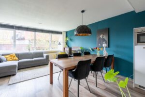 De keuken gaat over in de woonkamer met plek voor zowel een eethoek als een tv-hoek. De grote raampartij is gericht op het westen wat zorgt voor een fijne lichtinval.