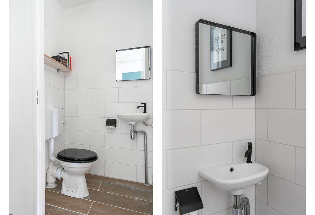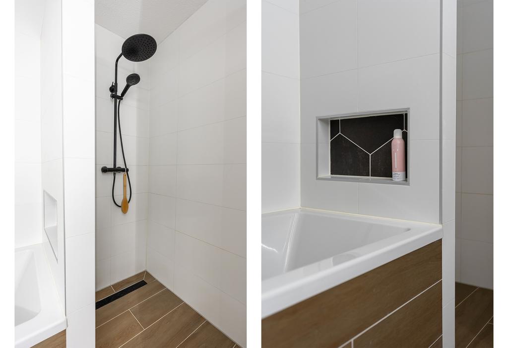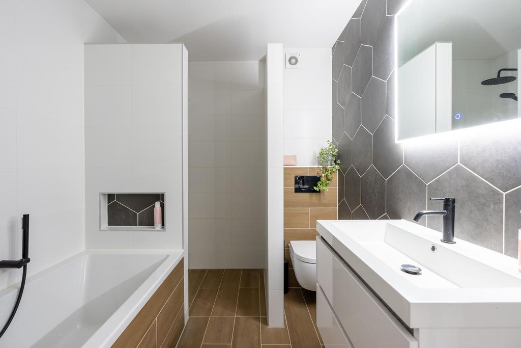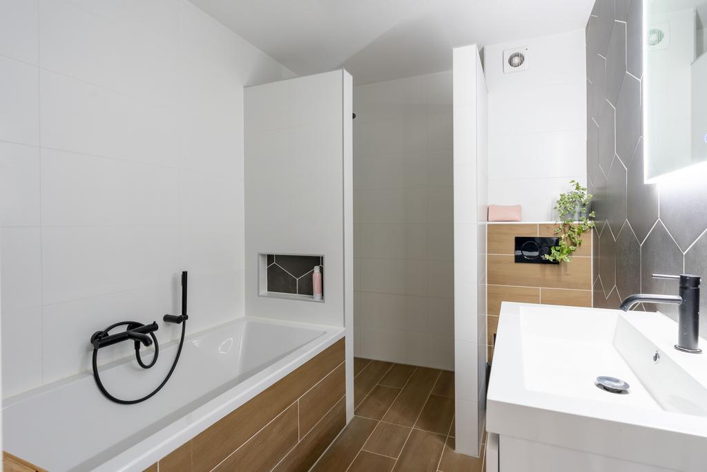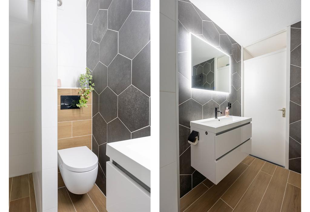 De badkamer is toch wel de eyecatcher van het huis. De badkamer is in 2021 volledig vernieuwd en is in een moderne tijdloze en neutrale kleurstelling. De ruimte is optimaal ingedeeld en daardoor voorzien van zowel bad, inloopdouche, toilet als wastafelmeubel. De 6-hoekige tegels op de wand zorgen voor een subtiel speels effect en de zwarte kranen en spiegel met ingebouwde verlichting maken het geheel meer dan af.