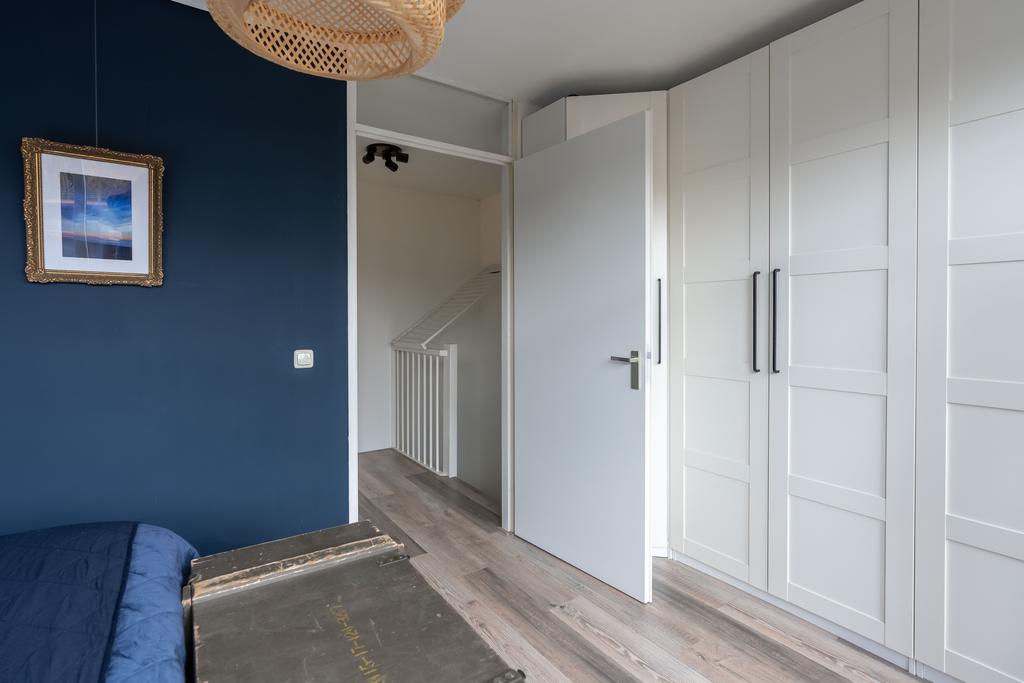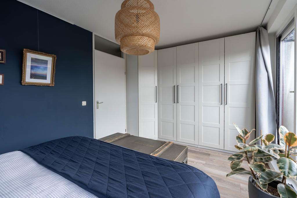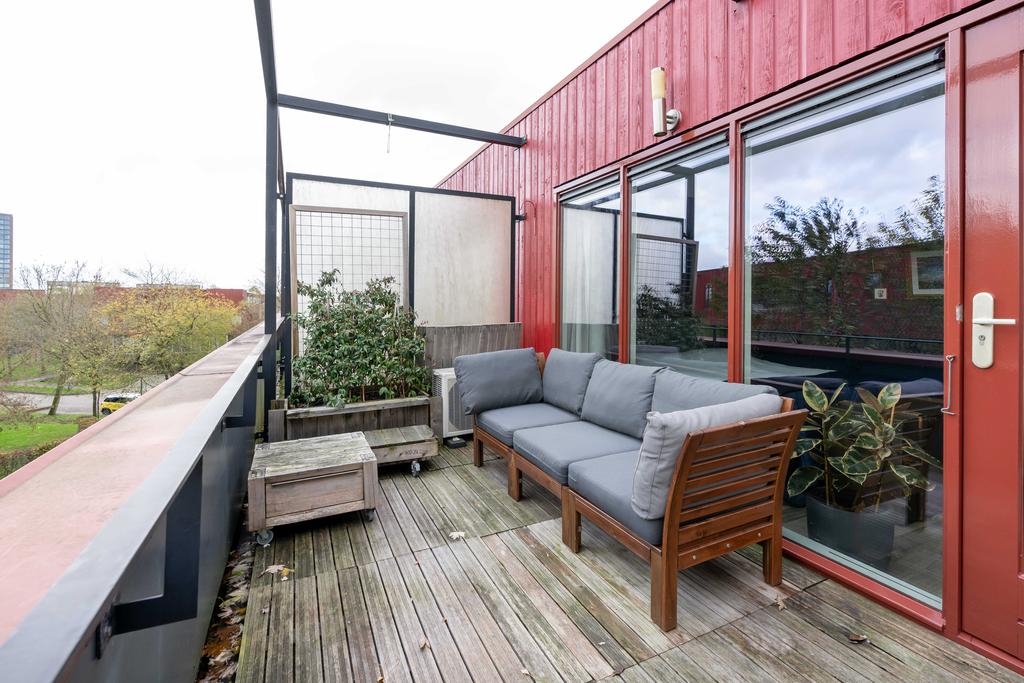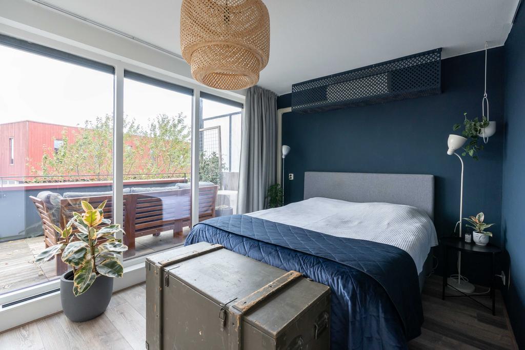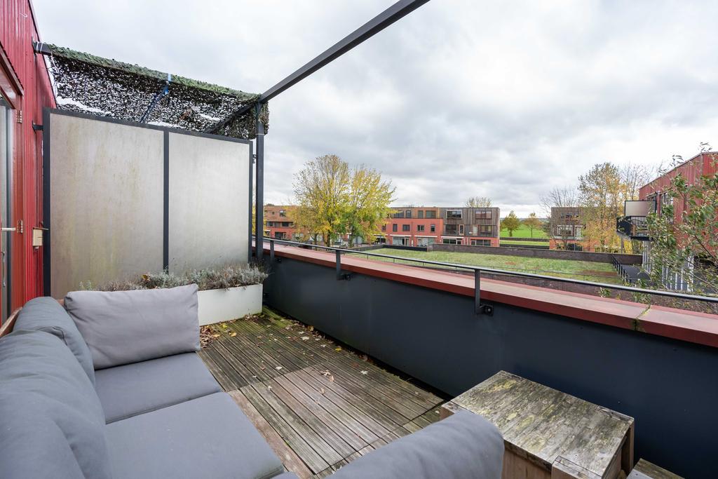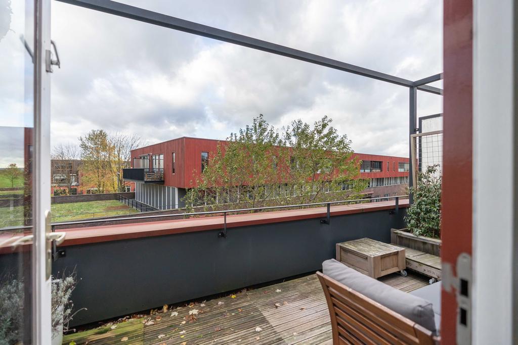 Nog een verdieping hoger vind je tenslotte de tweede ruime slaapkamer en een grote badkamer. De slaapkamer is met ca. 15 m2 van ruim formaat. Door de grote raampartijen is het een heerlijke lichte ruimte. De slaapkamer biedt toegang naar het ruime dakterras waar je zowel in de middag als in de avond van de zon en privacy kan genieten.