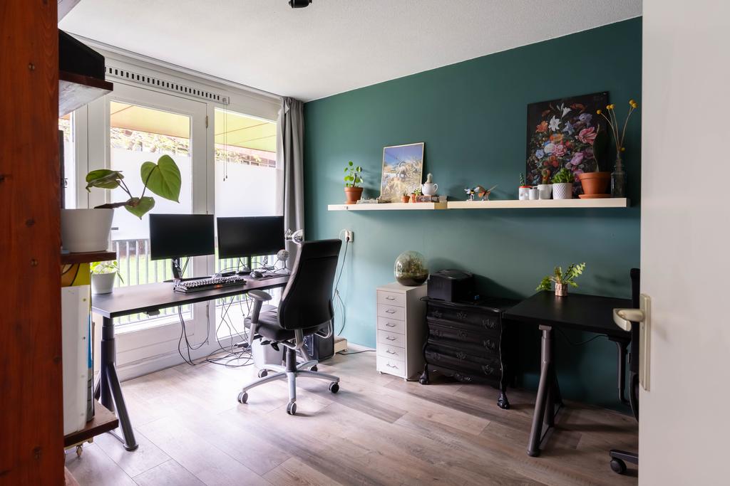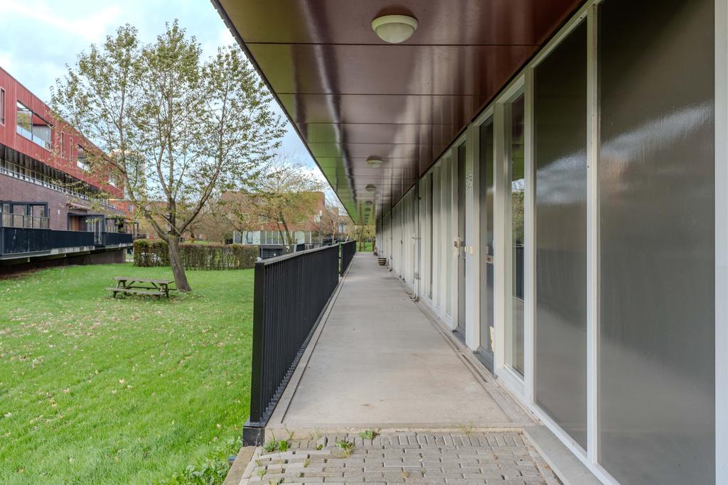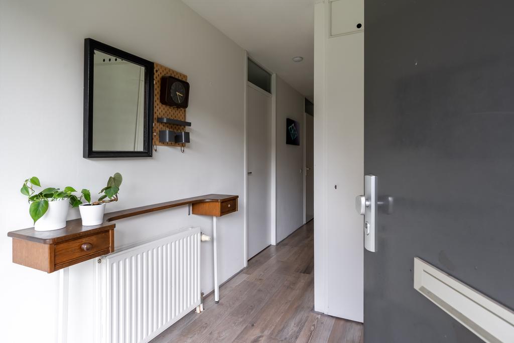 De iets verhoogde galerij brengt je naar de overdekte entree. Aan de voorzijde van het appartementencomplex is er een fijne groenstrook wat zorgt voor een plezierige afstand tot de overburen. De entree brengt je in de ruime hal met meterkast, garderoberuimte en toilet met fonteintje. Het toilet is in 2023 gerenoveerd in neutrale kleurstelling. Vanuit de hal bereik je ook de eerste ruime slaap/werkkamer. Deze kamer ligt aan de voorzijde en is ideaal om thuis te werken of bijvoorbeeld voor kantoor aan huis. Naast deze ruime kamer is op deze woonlaag een grote berging met wasmachine/droger aansluiting en veel opbergruimte.