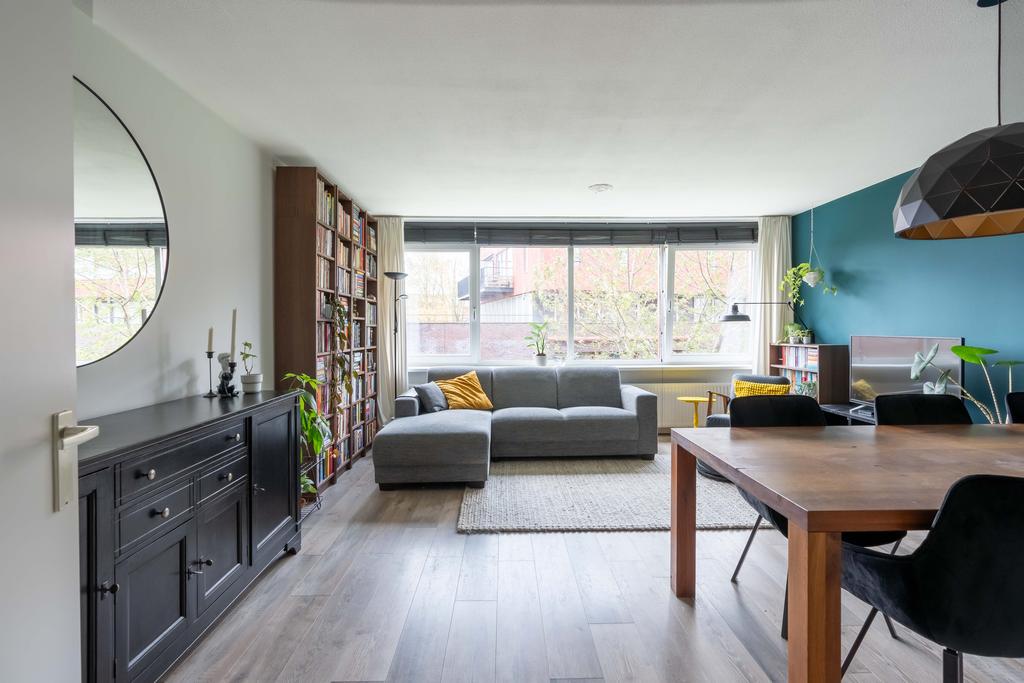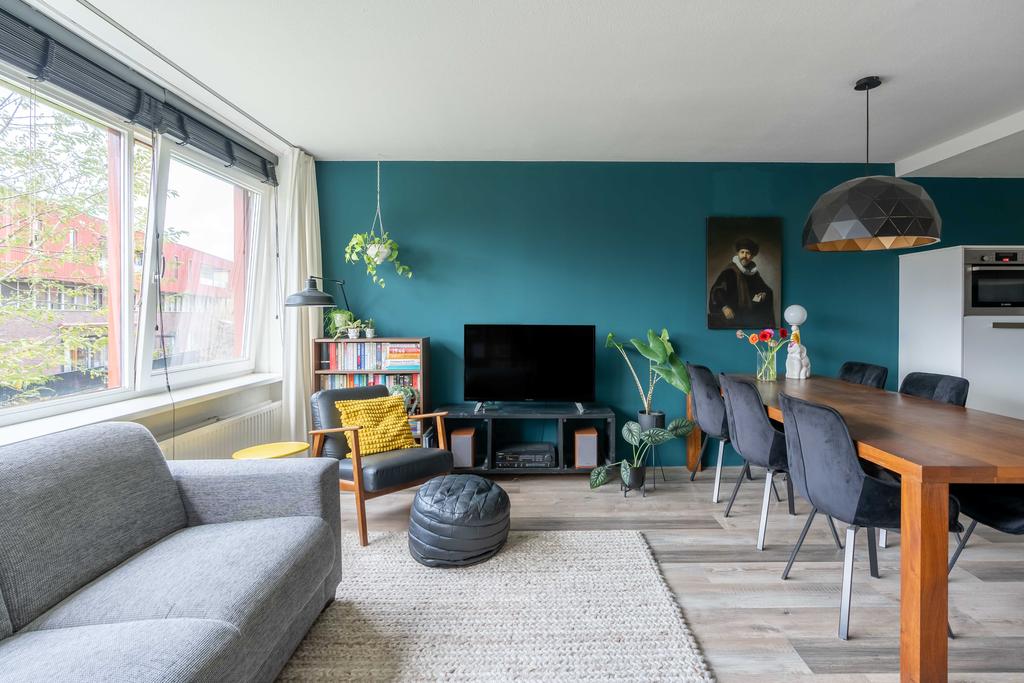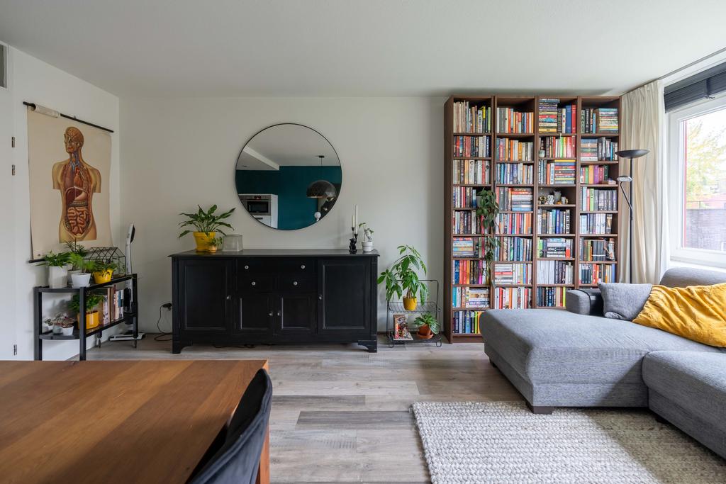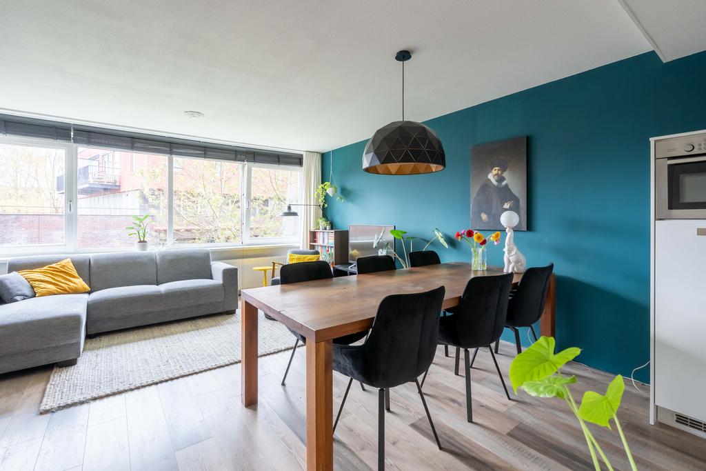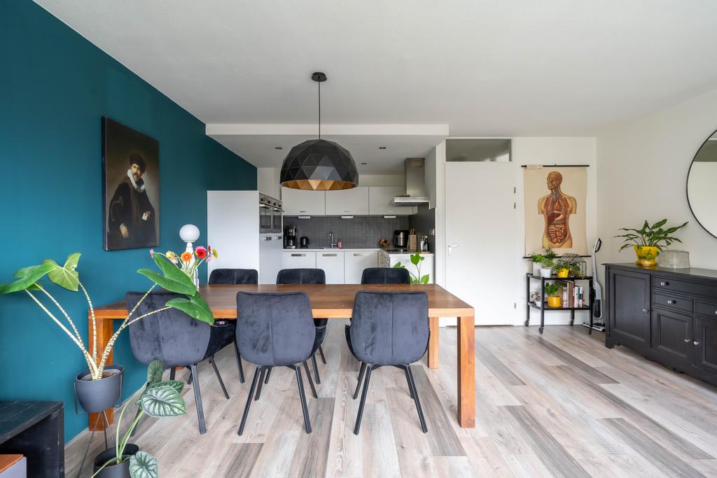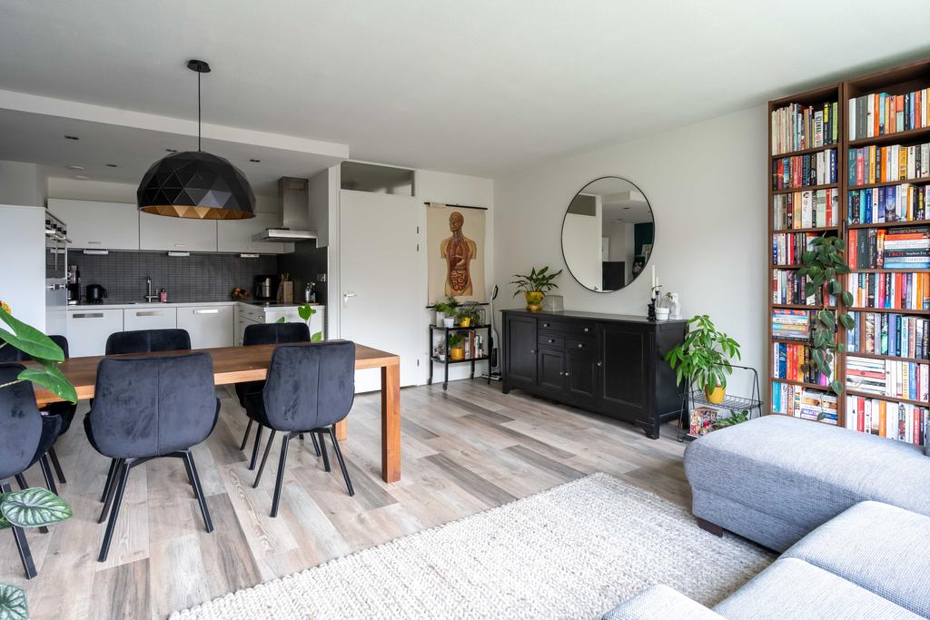 De keuken gaat over in de woonkamer met plek voor zowel een eethoek als een tv-hoek. De grote raampartij is gericht op het westen wat zorgt voor een fijne lichtinval.