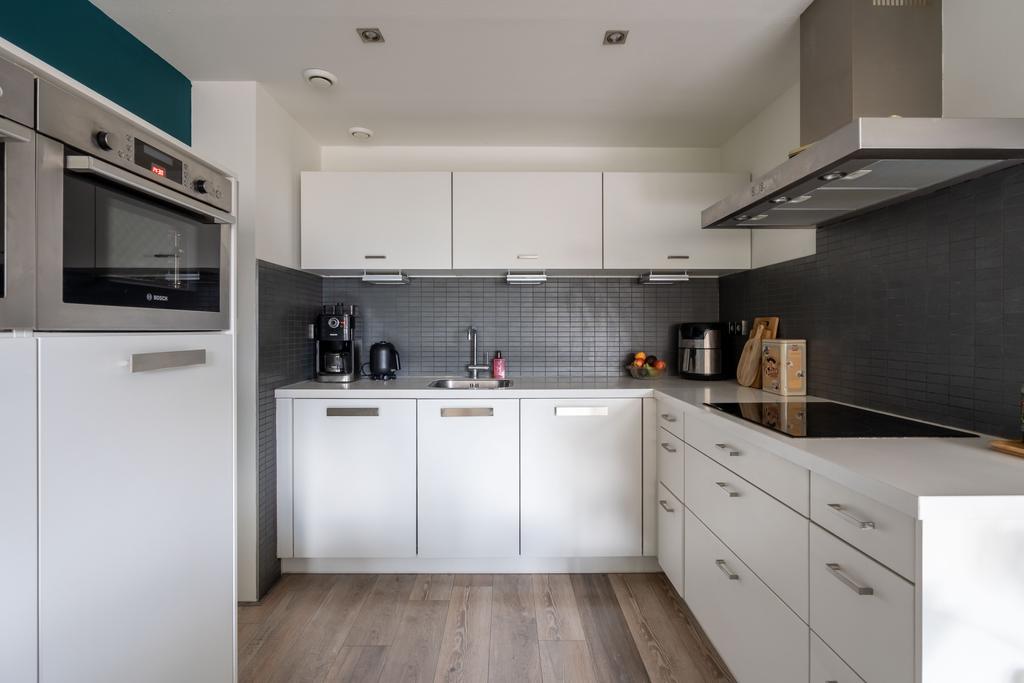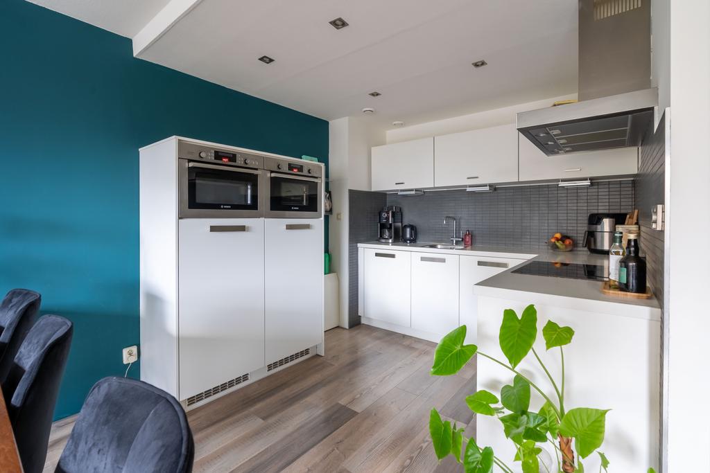 De trap brengt je naar de leefruimte op de tweede woonlaag. Hier vind je de keuken en woonkamer. De open keuken is in moderne kleurstelling met witte frontjes en een wit werkblad wat fraai combineert met de zwarte wandtegels. Door de hoekopstelling is veel werkruimte en genoeg plek voor al je keukenspullen. De keuken beschikt over alle nodige keukenapparatuur zoals vaatwasser, inductiekookplaat, koelkast, vriezer en een dubbele (stoom)oven/magnetron combinatie.
