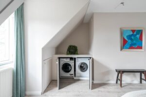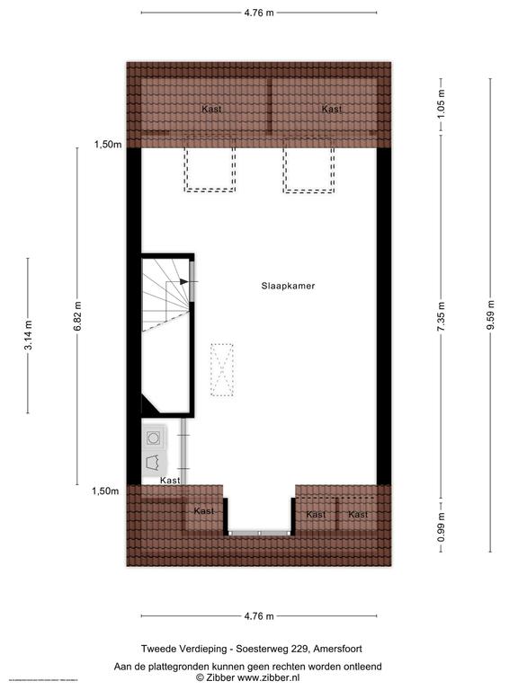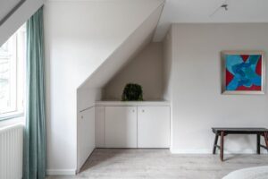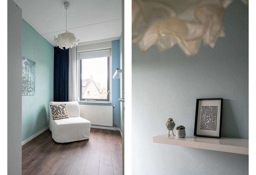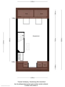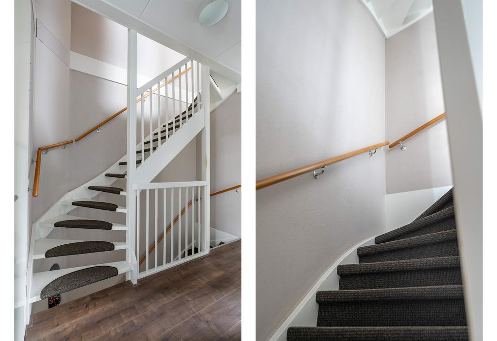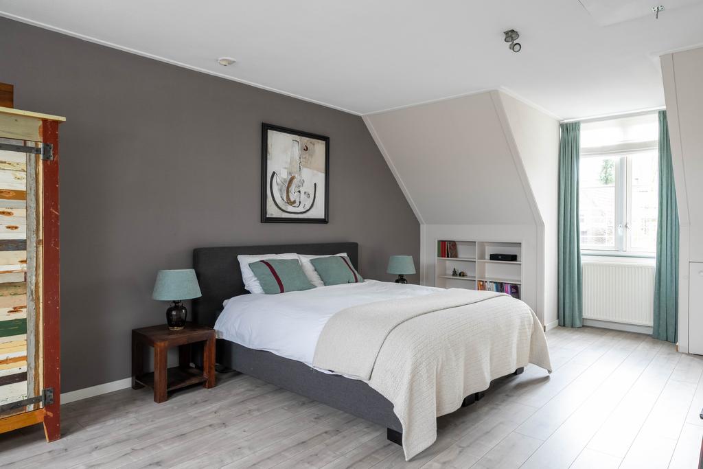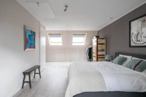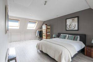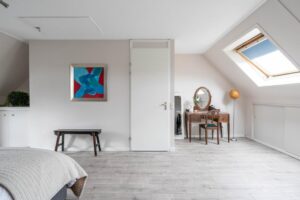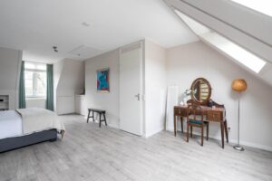 Een vaste trap brengt je naar de tweede verdieping die door de wijze van afwerking als een volwaardige woonlaag meetelt. Hier vind je dan ook een fraaie en riante vierde slaapkamer. De twee grote velux-ramen en dakkapel brengen een overvloed aan licht naar binnen. De vloer en wanden zijn strak afgewerkt en de wasmachine/drogeropstelling is keurig weggewerkt achter een vaste kast. De charmante dakkapel, de afwerking van de knieschotten en de ingebouwde boekenkast maken het geheel tenslotte in stijl af.