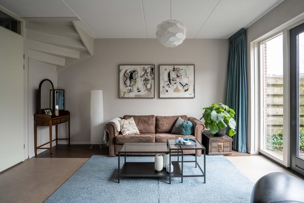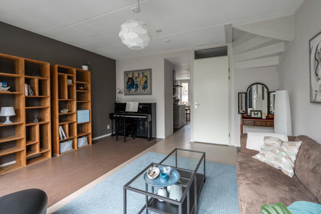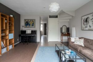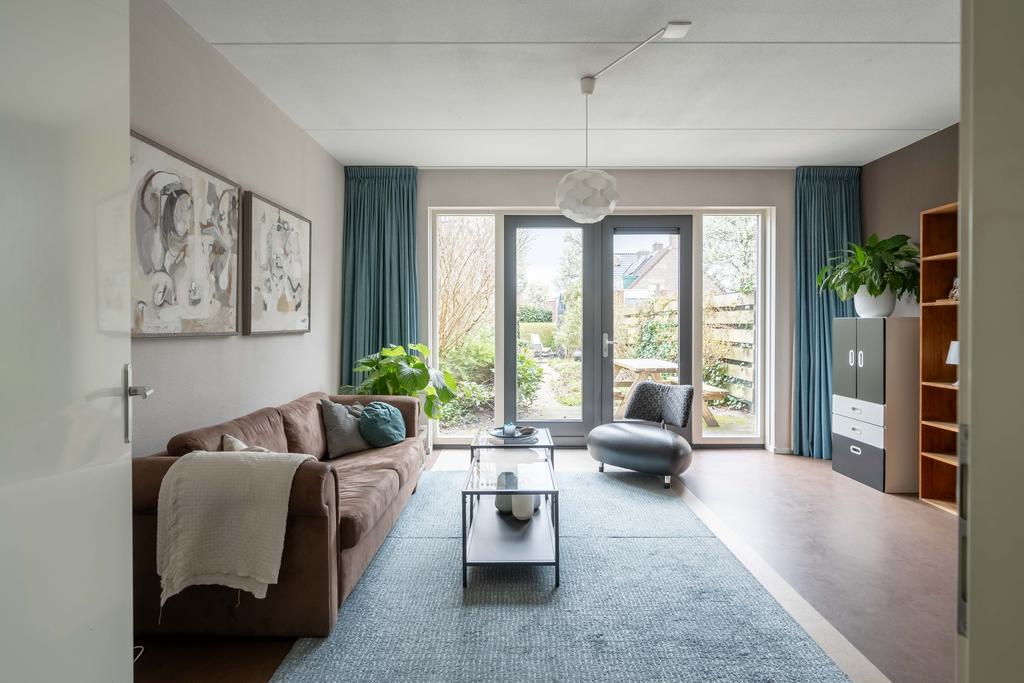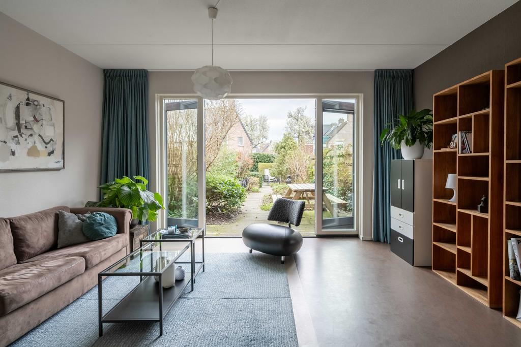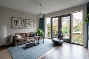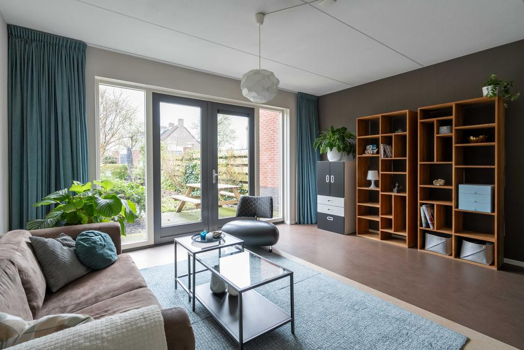 De woonkamer ligt aan de achterzijde. Hier is alle ruimte voor een sfeervolle zithoek. Door de grote raampartijen met glas tot aan de grond komt er een zee van licht naar binnen en sta je door de openslaande deuren heerlijk in verbinding met de tuin. De woonkamer kan, gezien de grootte van het perceel, naar wens nog makkelijk worden uitgebouwd.