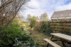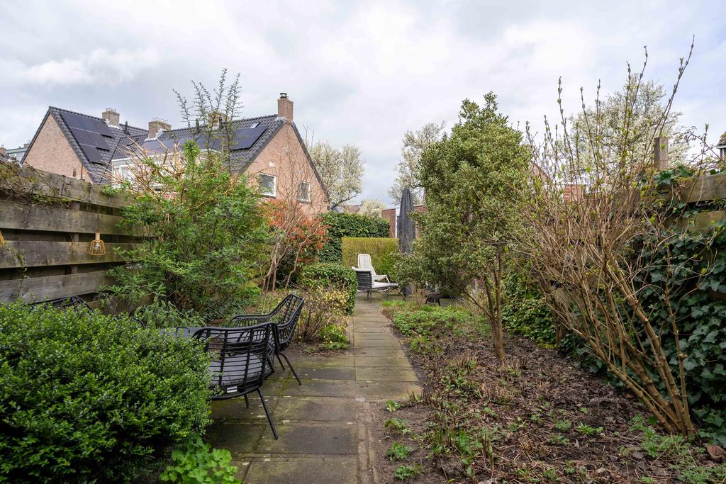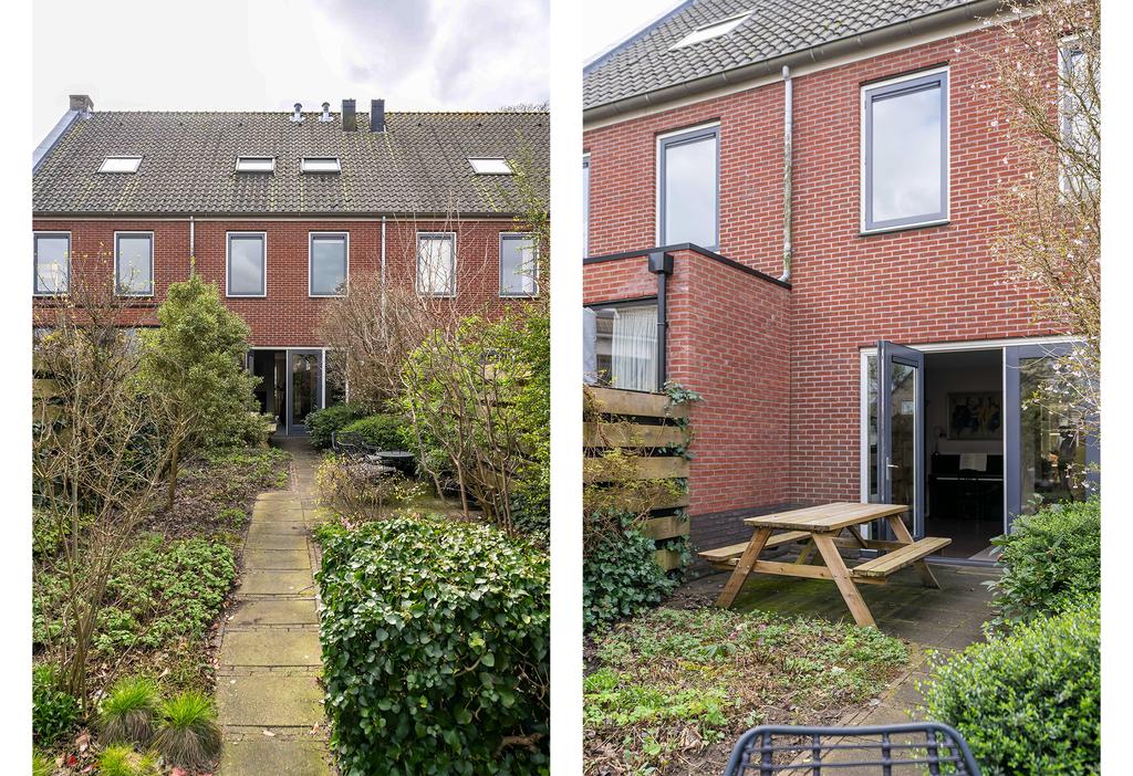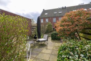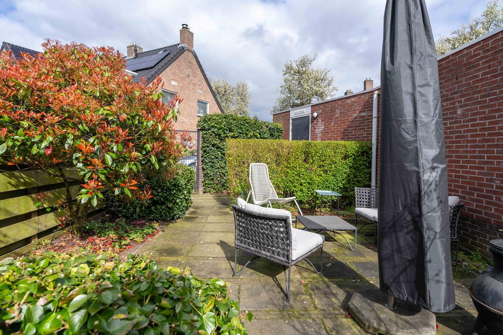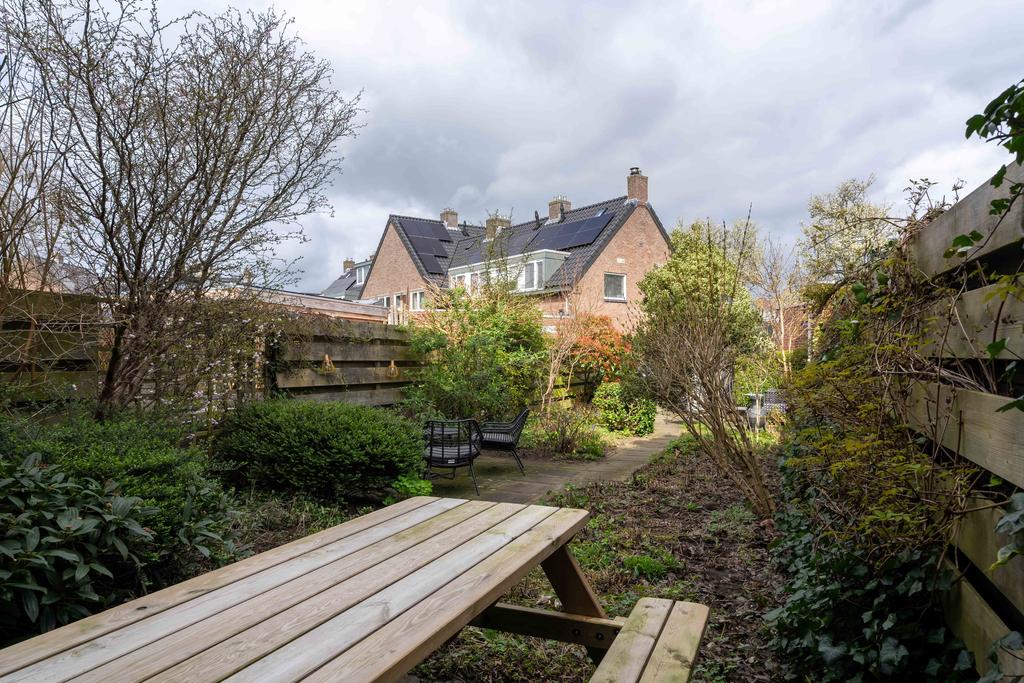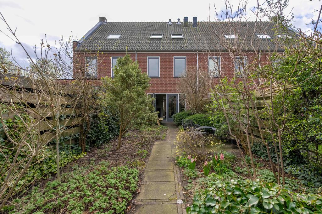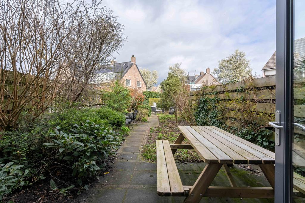 De achtertuin is maar liefst ca. 19 meter diep en ligt plezierig vrij ten opzichte van aangrenzende woningen. De diepte van de tuin zorgt ervoor dat je altijd wel ergens zon hebt in de tuin. De tuin is keurig aangelegd met diverse terrassen en fraaie groenborders. Verder vind je achterin de tuin een ruime stenen berging om fietsen en andere spullen in op te bergen. Aan de achterzijde van het huis bevindt zich nog het mandelig terrein met daarop een eigen parkeerplaats met mogelijkheid tot het plaatsen van een eigen laadpaal.