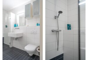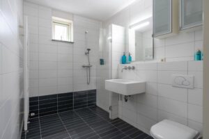 De badkamer is van groot formaat, modern afgewerkt in neutrale kleurstelling en voorzien van wastafel, toilet en een ruime inloopdouche. Het raam zorgt voor de natuurlijke en plezierige daglichttoetreding.