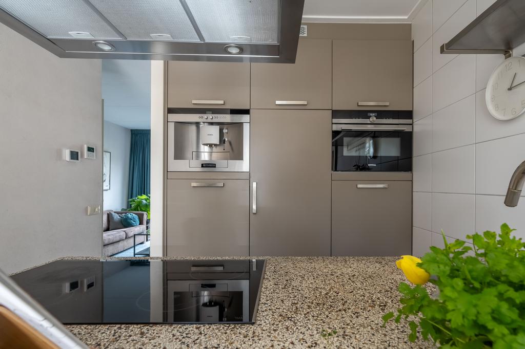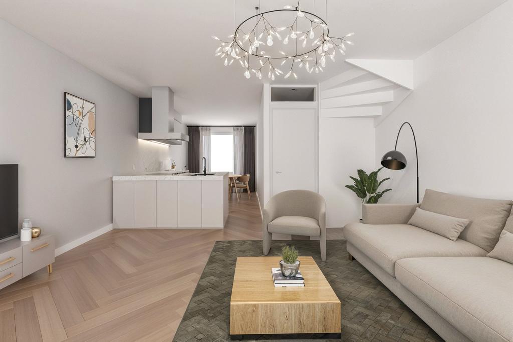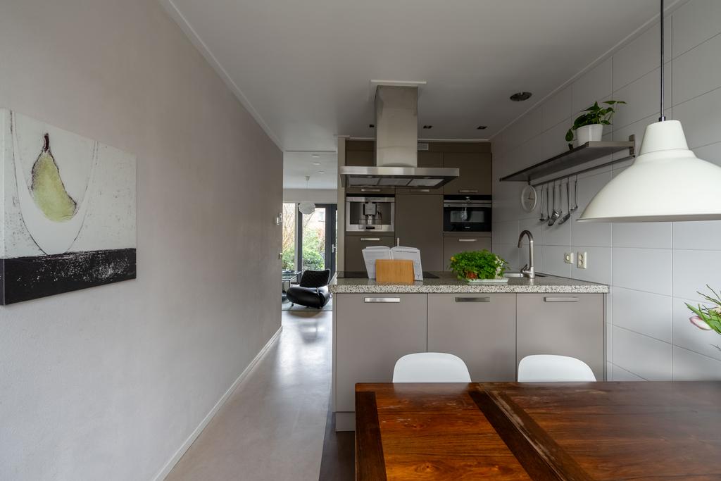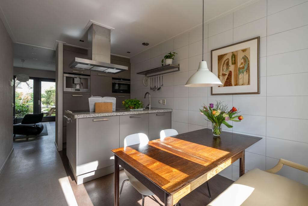 De leefkeuken is aan de voorzijde van het huis en is voorzien van een schiereiland met keramische kookplaat, wasemkap, spoelbak en vaatwasser. De kleurstelling van de keuken is taupe met een fraai en duurzaam terrazzo aanrechtblad. Het keukenblok aan de wand is voorzien van koelkast, ingebouwde espresso-/koffie-volautomaat en oven. Het eetgedeelte wordt afgemaakt met ruimte voor een grote eettafel. Zo kan je koken en tegelijkertijd gezellig bijkletsen met je huisgenoten.
