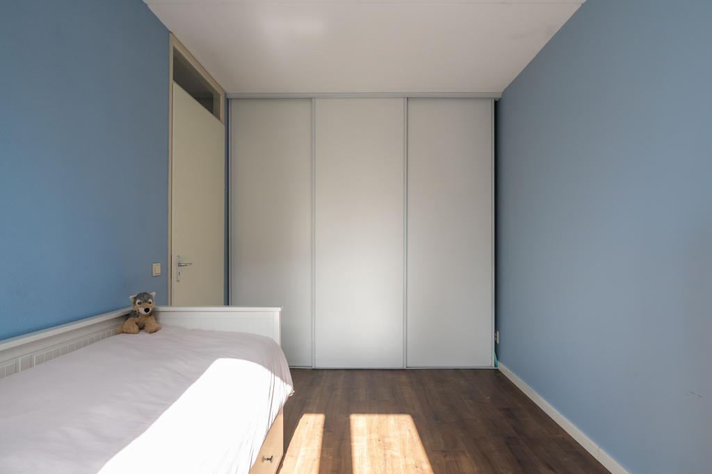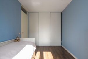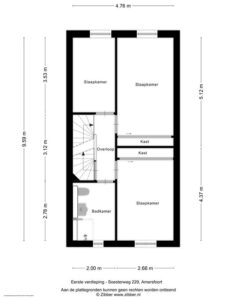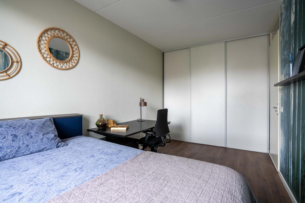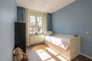 De trap in de hal brengt je naar de eerste verdieping. Je vindt op deze woonlaag 3 slaapkamers en een grote badkamer. De grootste slaapkamer meet ca. 14 m2 en biedt plek aan een groot bed en een riante kledingkast. De kamer is plezierig licht door de grote raampartij. De tweede slaapkamer aan de achterzijde meet ca. 7 m2 en is zeer geschikt als werkkamer of kinderkamer. Door de afmeting van de kamer past hier ook prima een eenpersoonsbed. Aan de voorzijde van het huis bevindt zich de derde slaapkamer en de badkamer. Deze derde slaapkamer is ook ruim met ca. 12 m2.