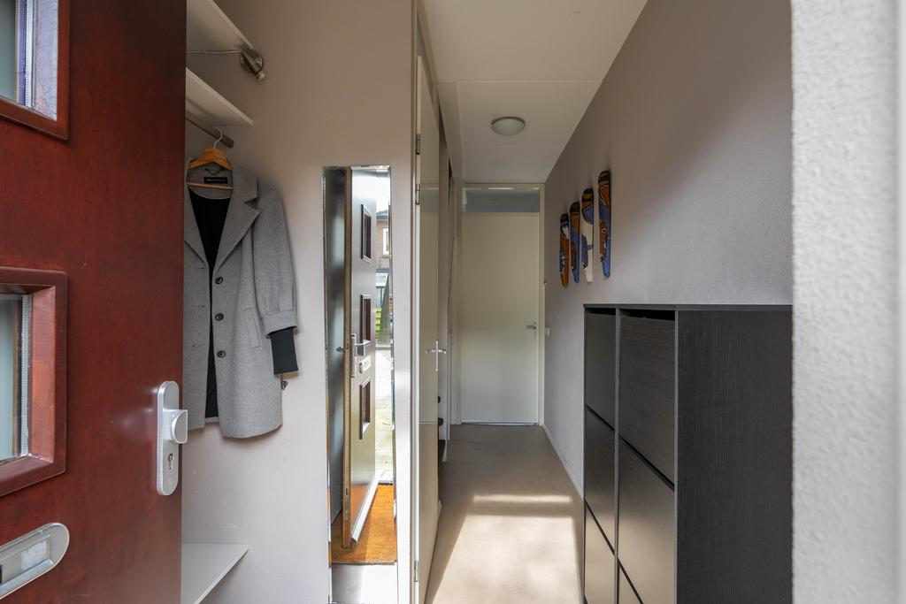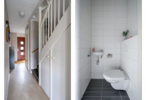 Aan de voorzijde van het huis vind je een compacte tuin, een goede plek voor een bankje of je (bak)fiets. Via de half-overdekte entree kom je in de hal met garderobe, meterkast, toilet, trapkast, opgang naar de eerste verdieping en de toegang tot de woonkamer. De hele benedenverdieping is voorzien van comfortabele vloerverwarming. Het keurige toilet is in neutrale en moderne kleurstelling, ruim van formaat en voorzien van fonteintje.