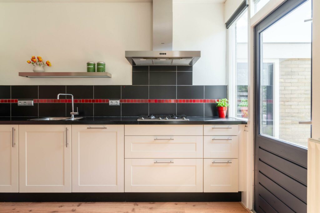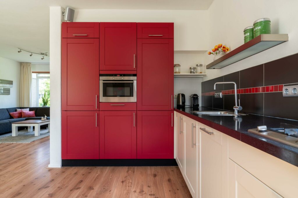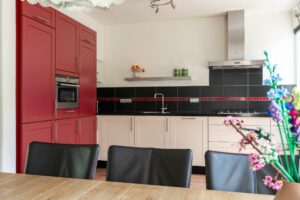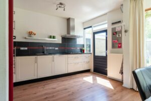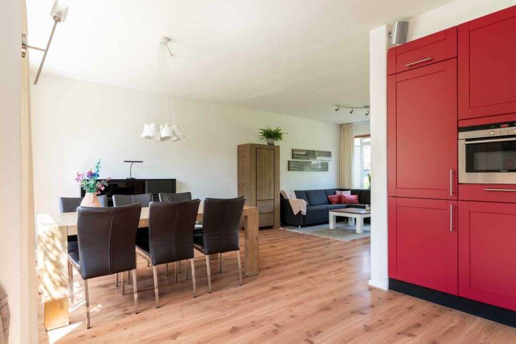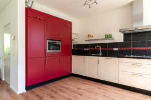 De keuken is van ruim formaat en keurig afgewerkt met een donker composiet werkblad en een combinatie van donkerrode en witte kastfrontjes. Verder is de keuken voorzien van alles wat je nodig hebt: een vaatwasser, koel-vriescombi, 4-pits gaskookplaat, combimagnetron en veel kastruimte. De loopdeur in de keuken brengt je naar de tuin.
