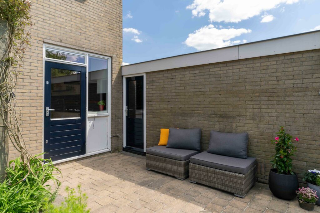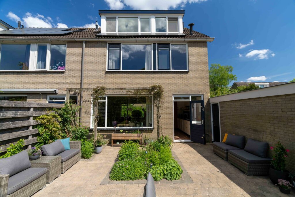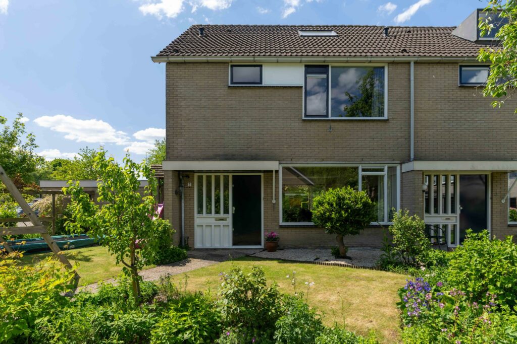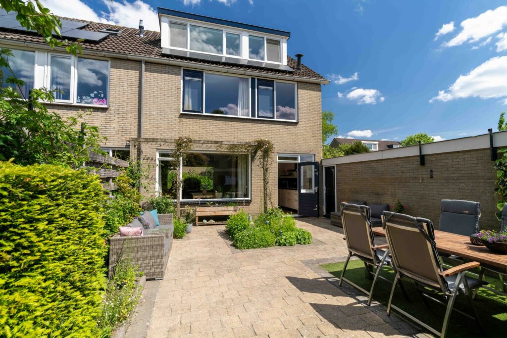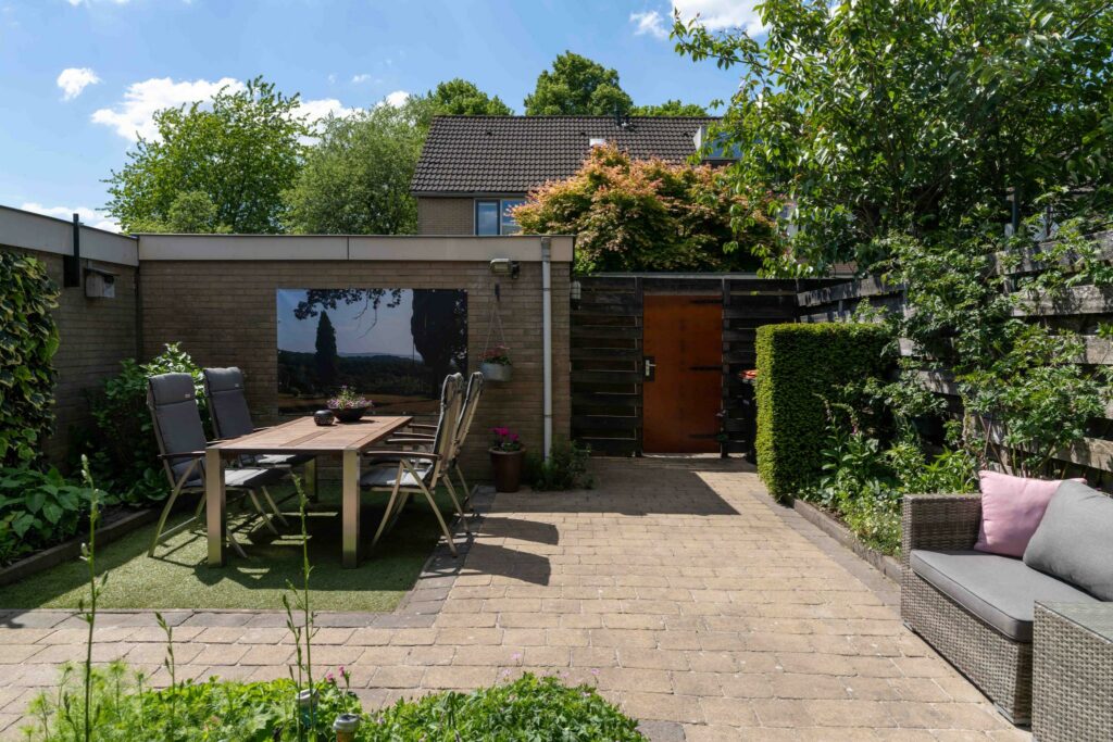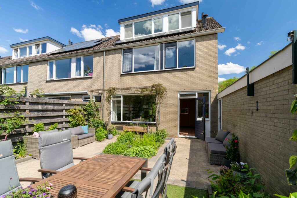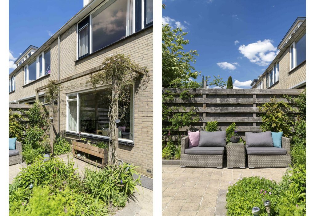 De achtertuin ligt op het zuidwesten en is van goed formaat. De tuin is praktisch aangelegd met een combinatie van bestrating en groene borders, gevuld met diverse planten en mooie klimmers. Direct aan de achtergevel staat een sfeervolle pergola, rijk begroeid met clematis. Achter in de tuin staat nog een handige berging voor je fietsen of tuinspullen. De achtertuin is tenslotte ook nog via een achterom bereikbaar.