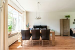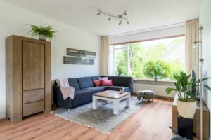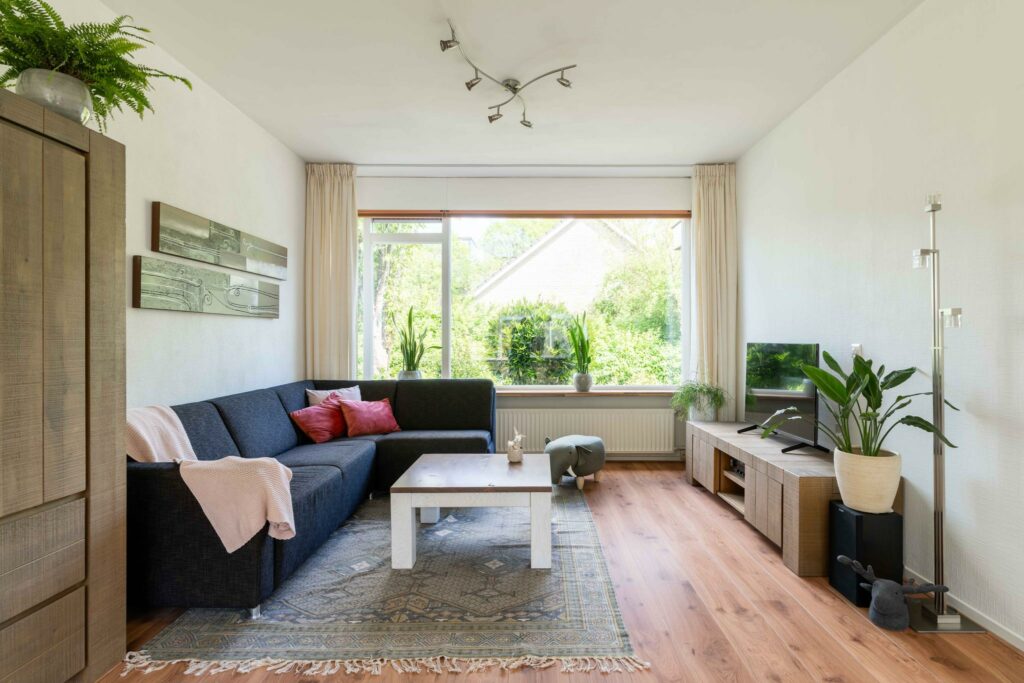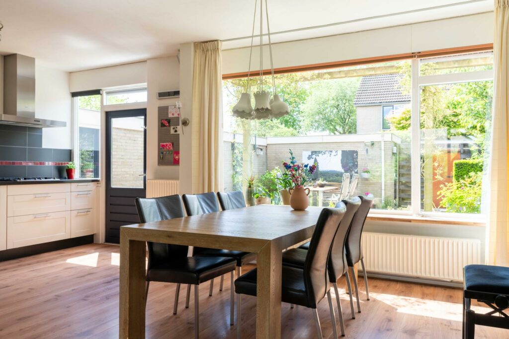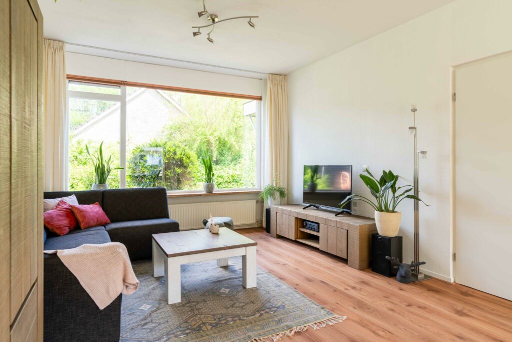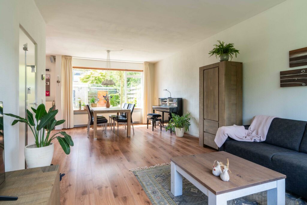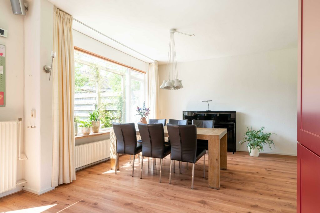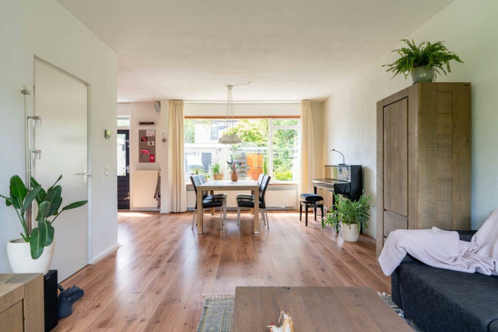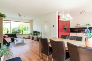 De ruime woonkamer ligt aan de voorzijde van de woning en heeft een groot raam dat zorgt voor veel daglicht. Er is meer dan genoeg ruimte voor een comfortabele zithoek én een ruime eethoek bij de open keuken.